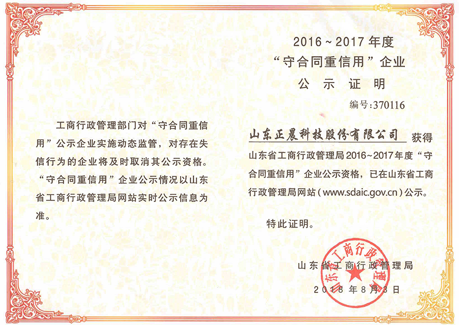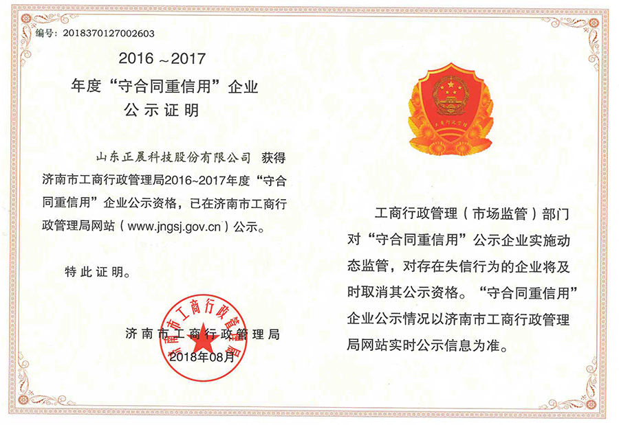 近日,山东开云电子_开云电子(中国)科技股份有限公司荣获2016-2017年度山东省工商行政管理局“守合同重信用”荣誉称号和济南市工商行政管理局“守合同重信用”荣誉称号,这也是开云电子_开云电子(中国)股份自2009年起连续十年获此殊荣。